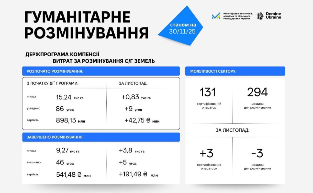 У листопаді аграрії отримали майже 3,8 тисячі га розмінованих земель