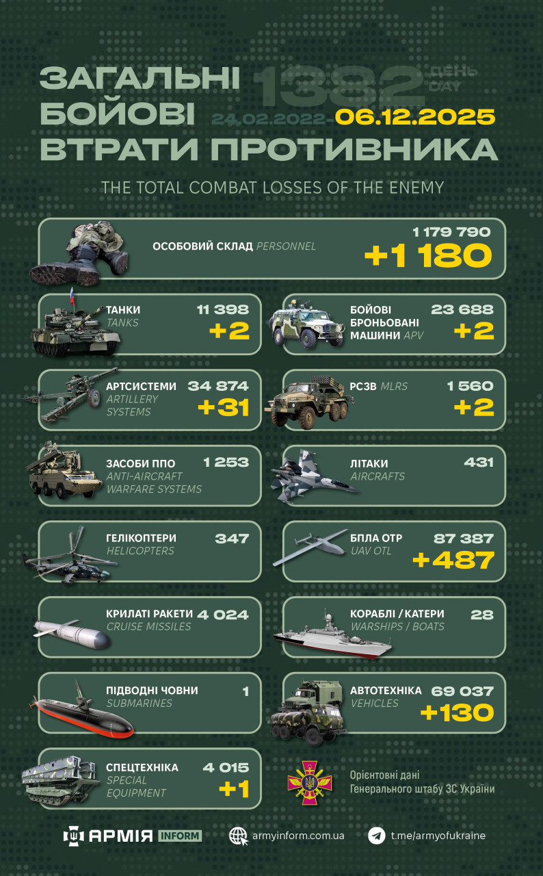 06 Гру. 2025 р. 00:54 06 грудня 2025 р. 00:54На фронті - 180 зіткнень, ЗСУ знешкодили понад сотню окупантів на Покровському напрямку